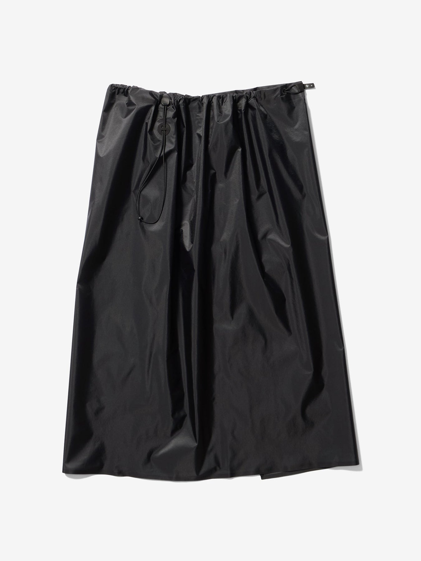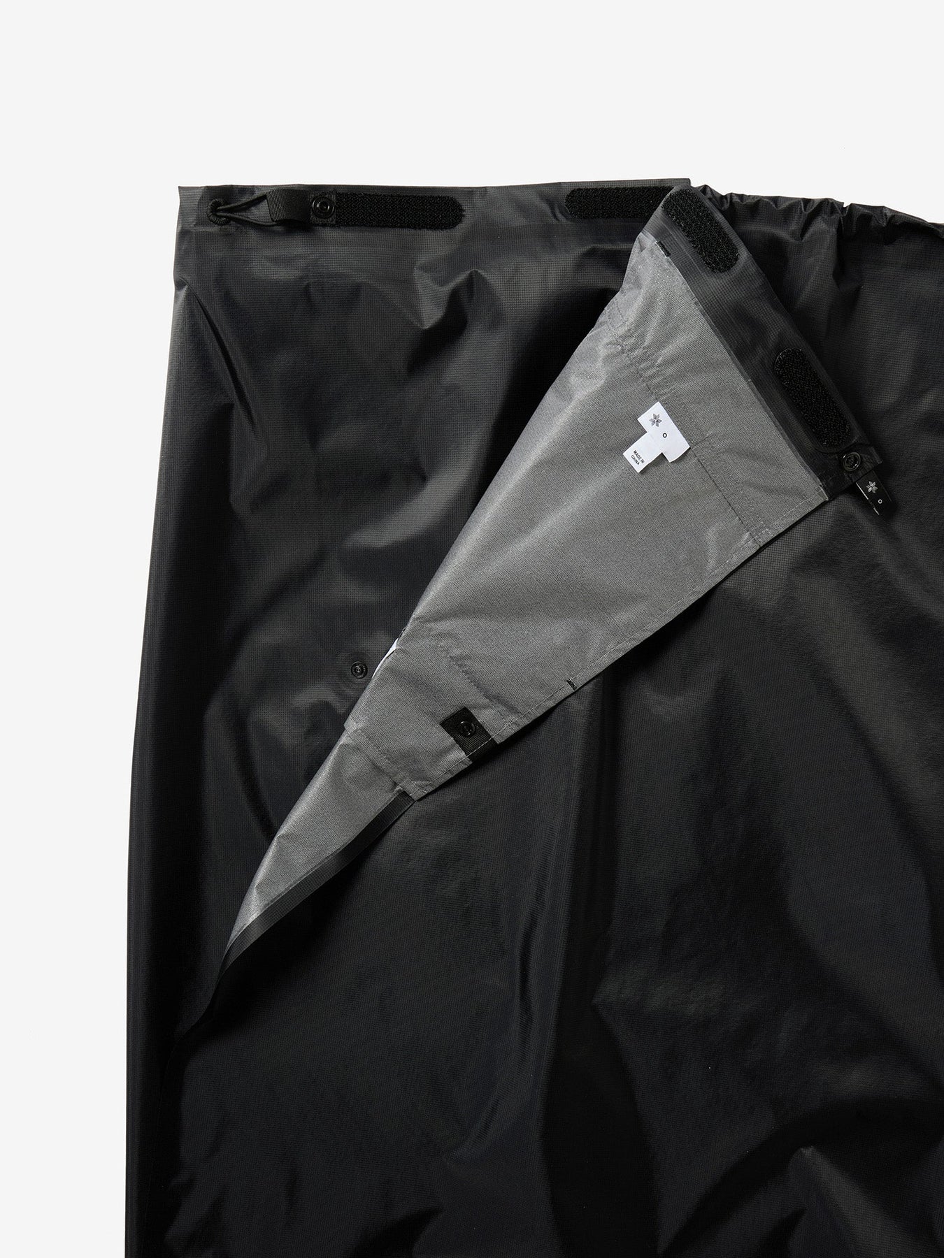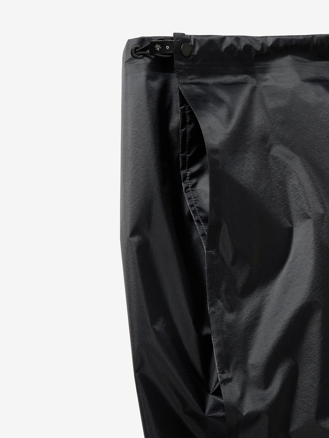 This waterproof rain wrap is made with 3-layer fabric and fully seam-sealed construction. It features an exceptionally lightweight, translucent nylon material that offers both waterproofness and breathability. Easier to put on than traditional rain pants, it protects the lower body from rain while remaining convenient to wear. The waist is adjustable with a drawcord, and the wrap is packable into its side pocket for compact storage.