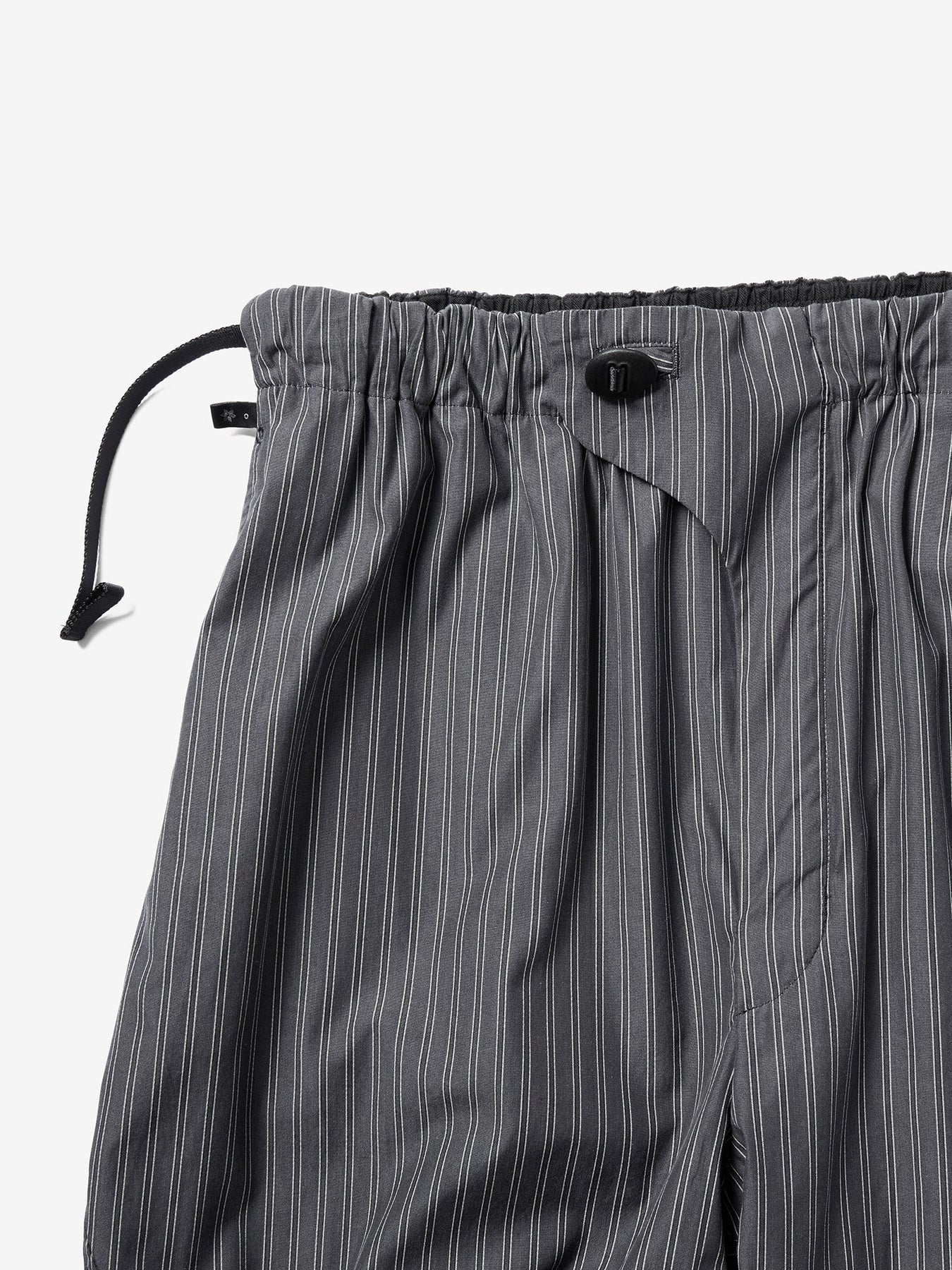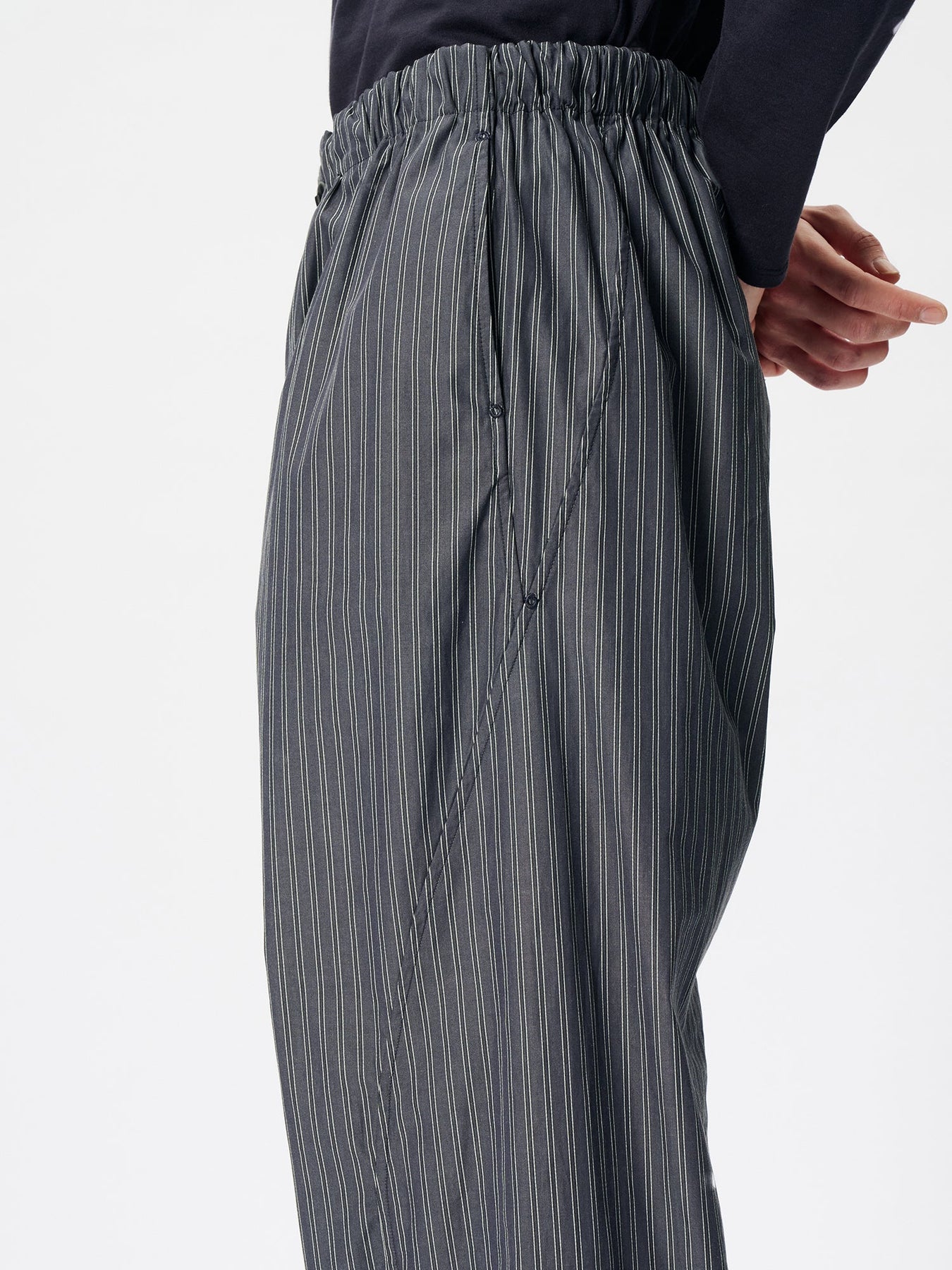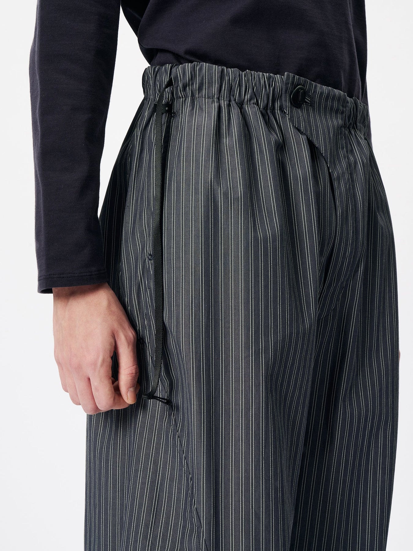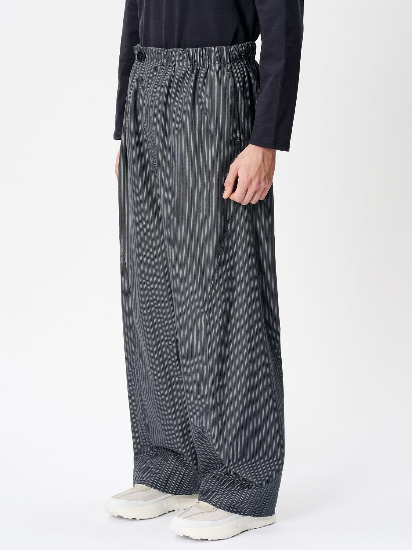 These pants are crafted from an original fabric featuring classic stripes woven with reflective threads. Designed with a relaxed fit, the wrap-style waist sits comfortably at the hips. The waist can be adjusted using original adjustable buttons for a personalized fit.