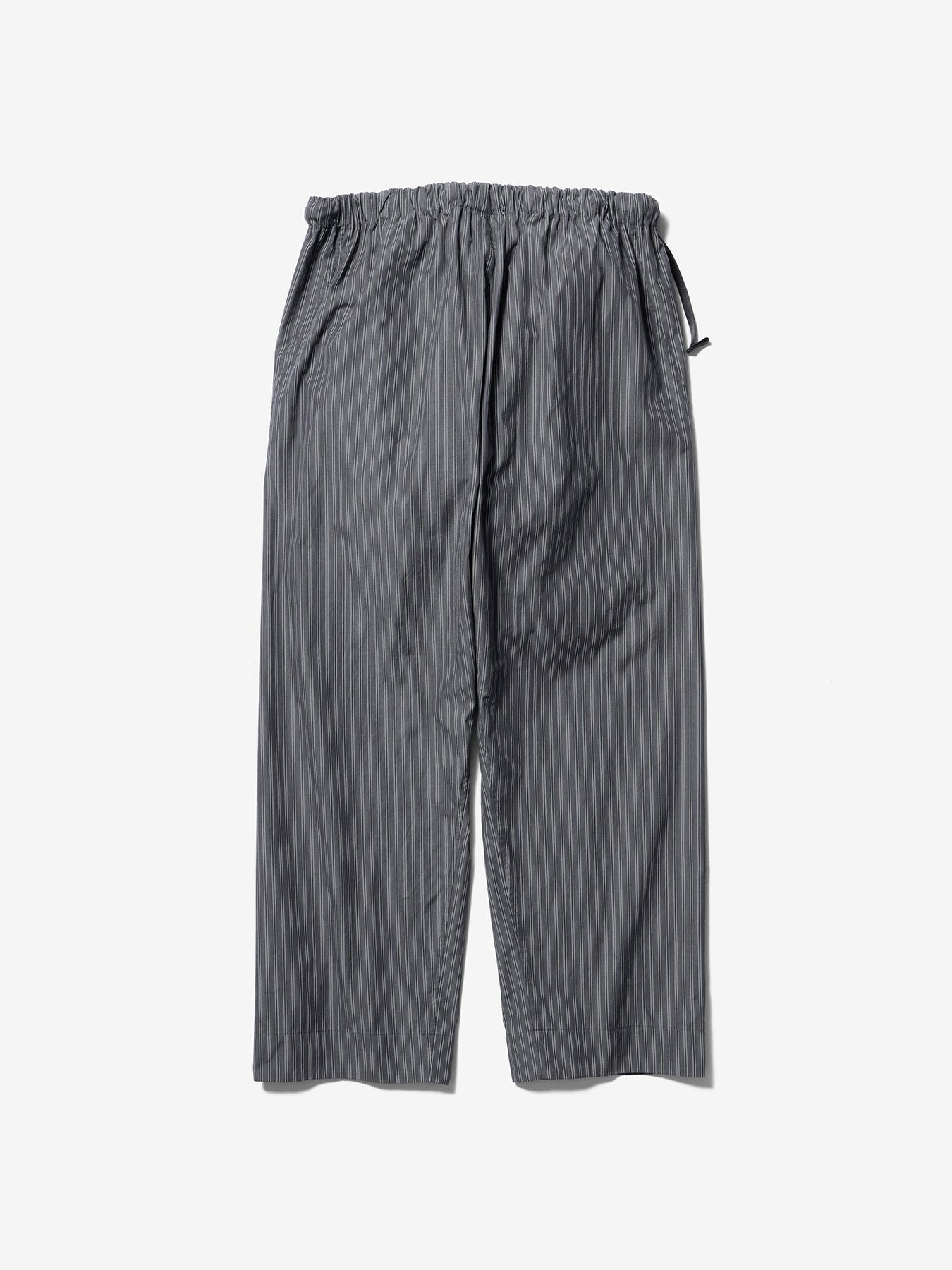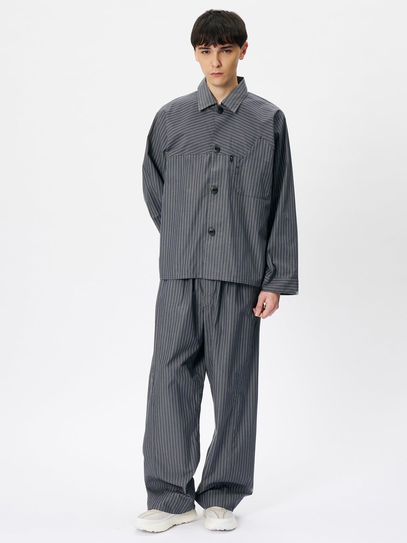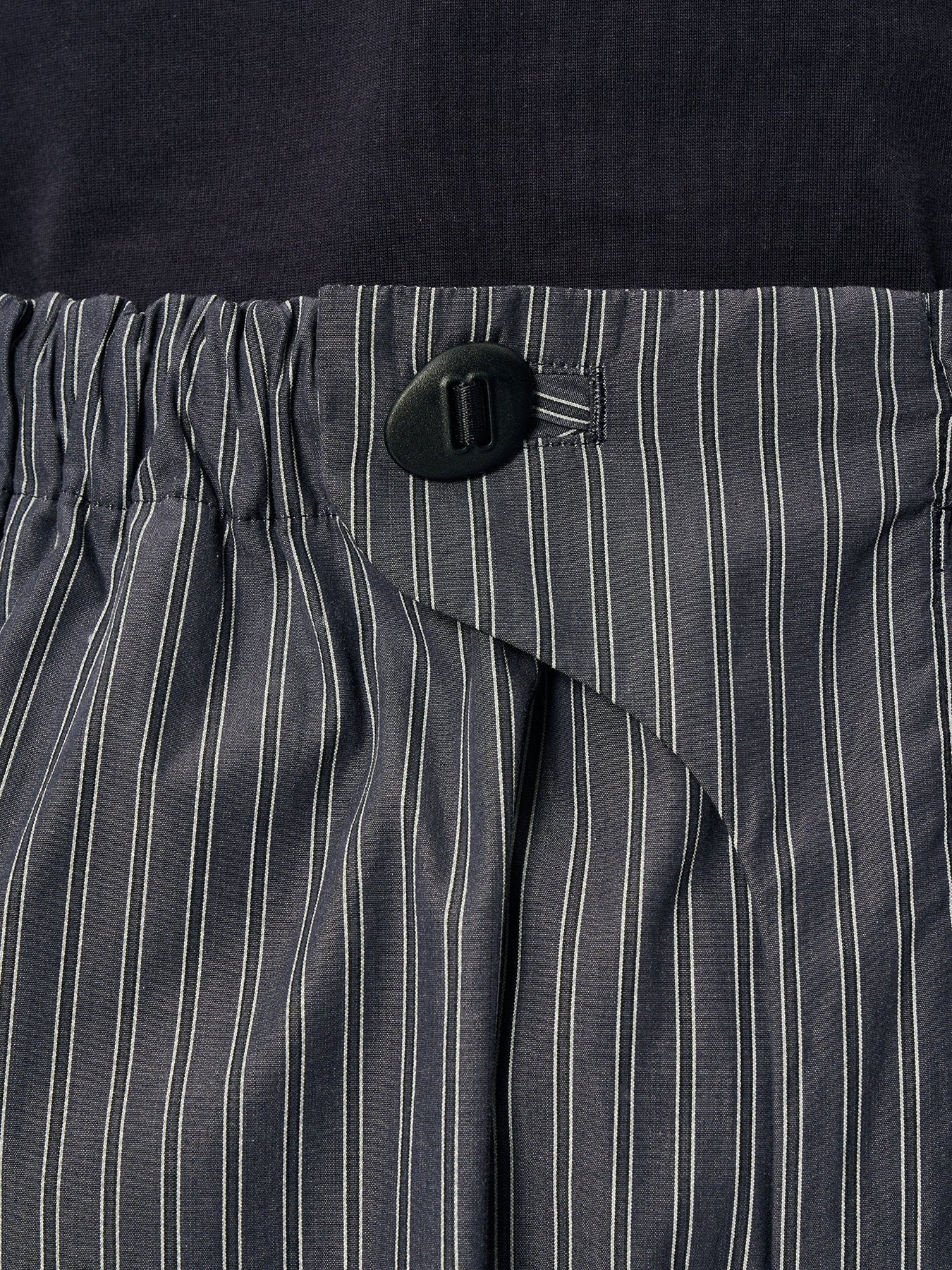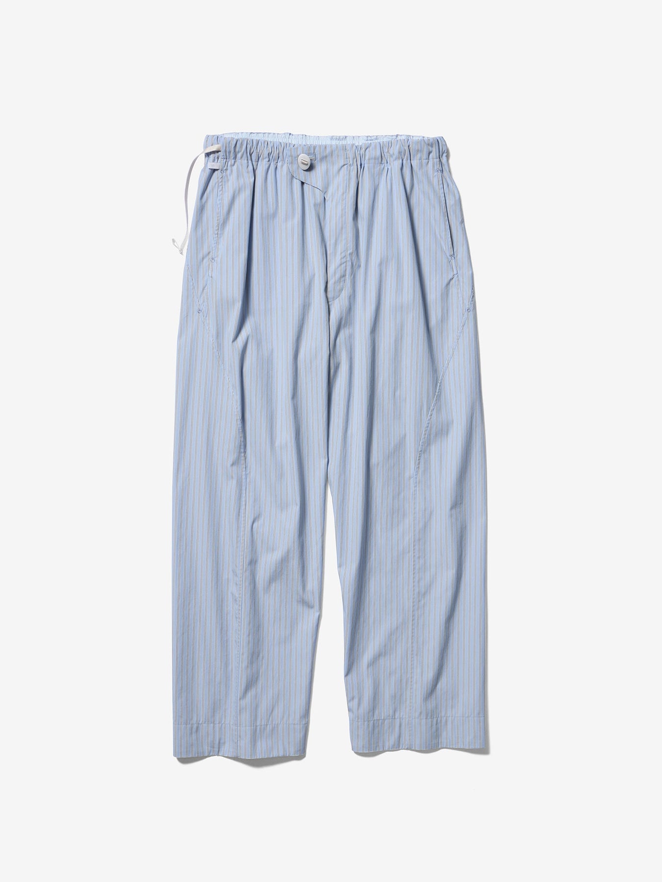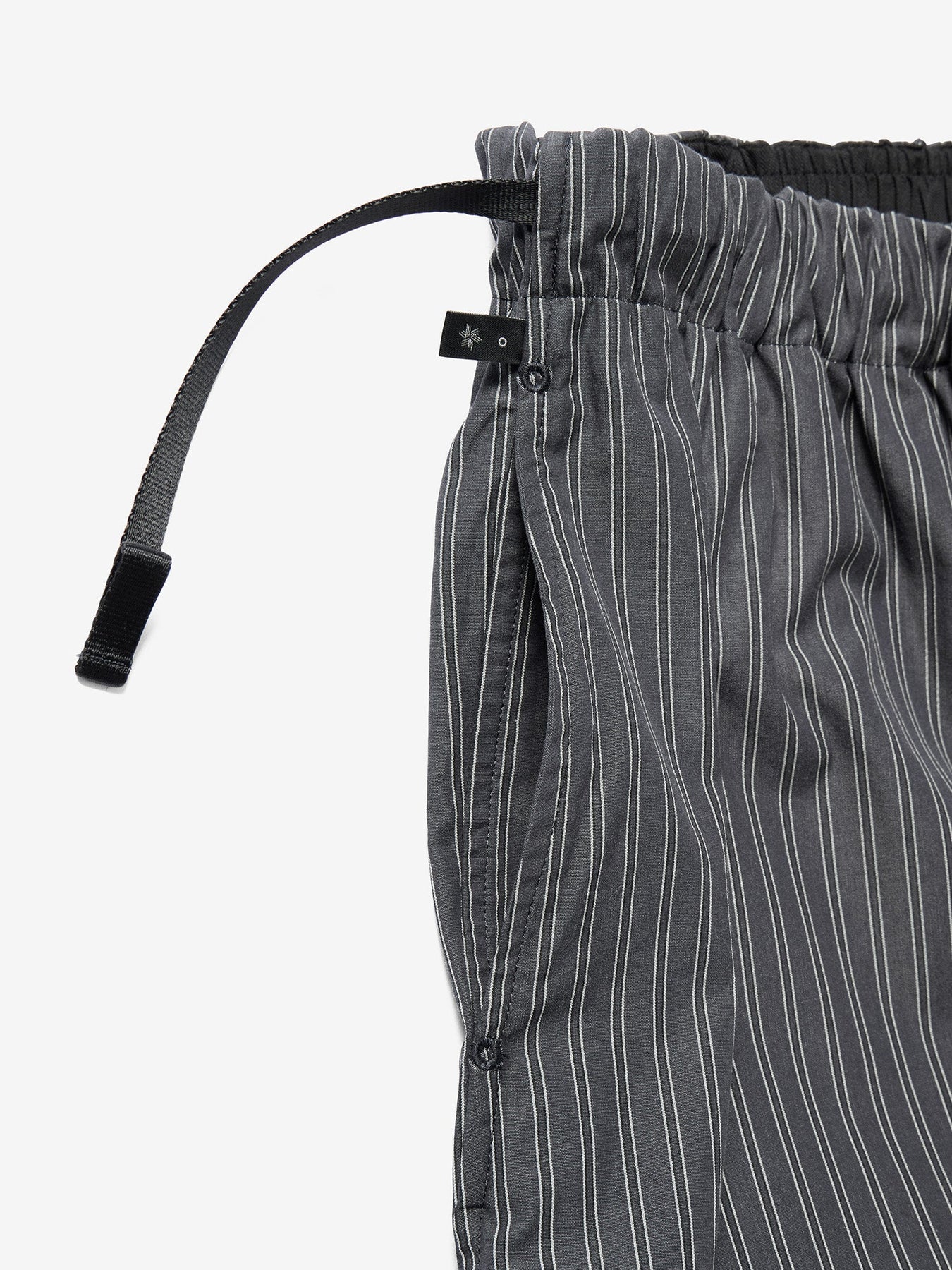 These pants are crafted from an original fabric featuring classic stripes woven with reflective threads. Designed with a relaxed fit, the wrap-style waist sits comfortably at the hips. The waist can be adjusted using original adjustable buttons for a personalized fit.
