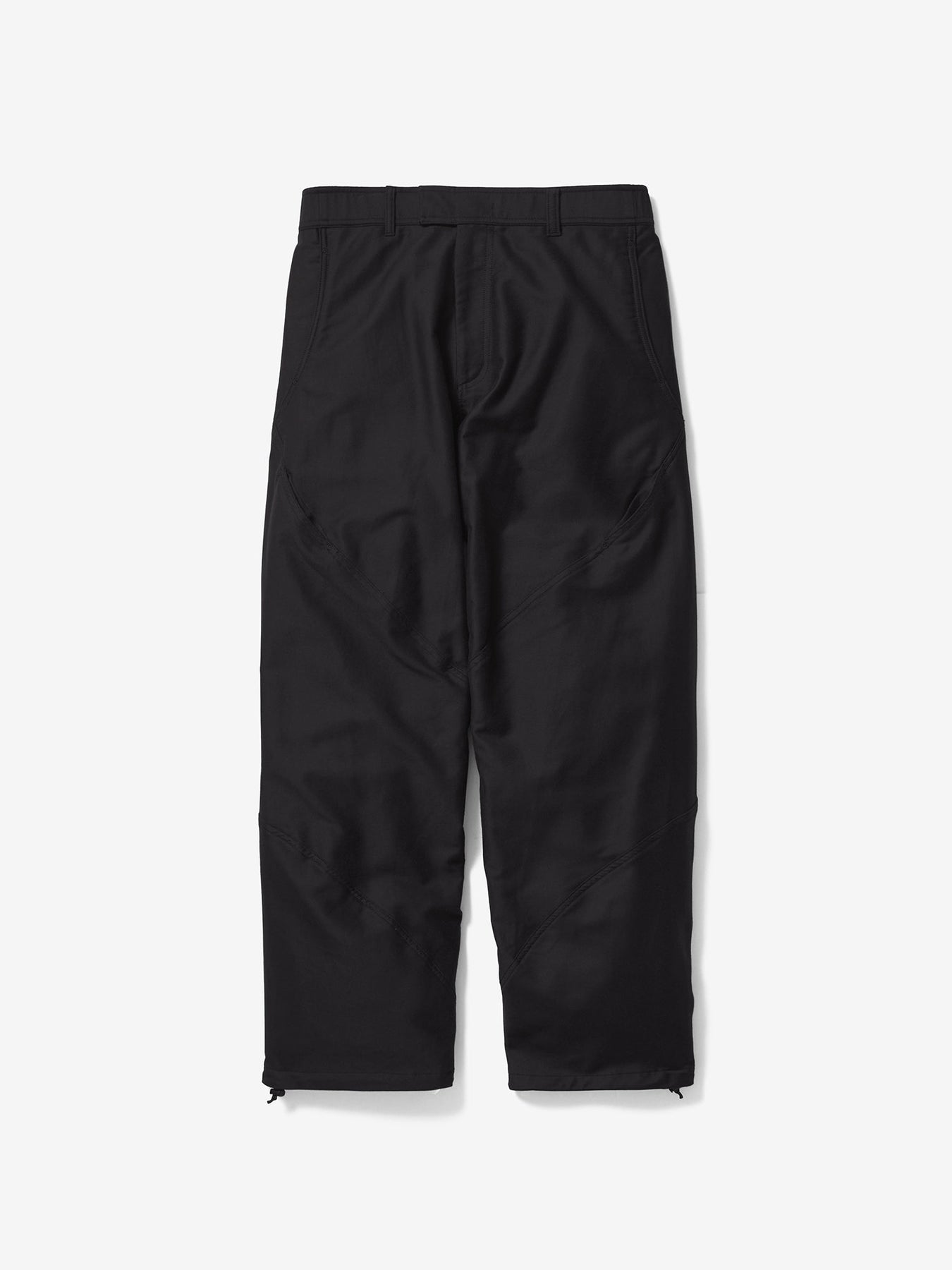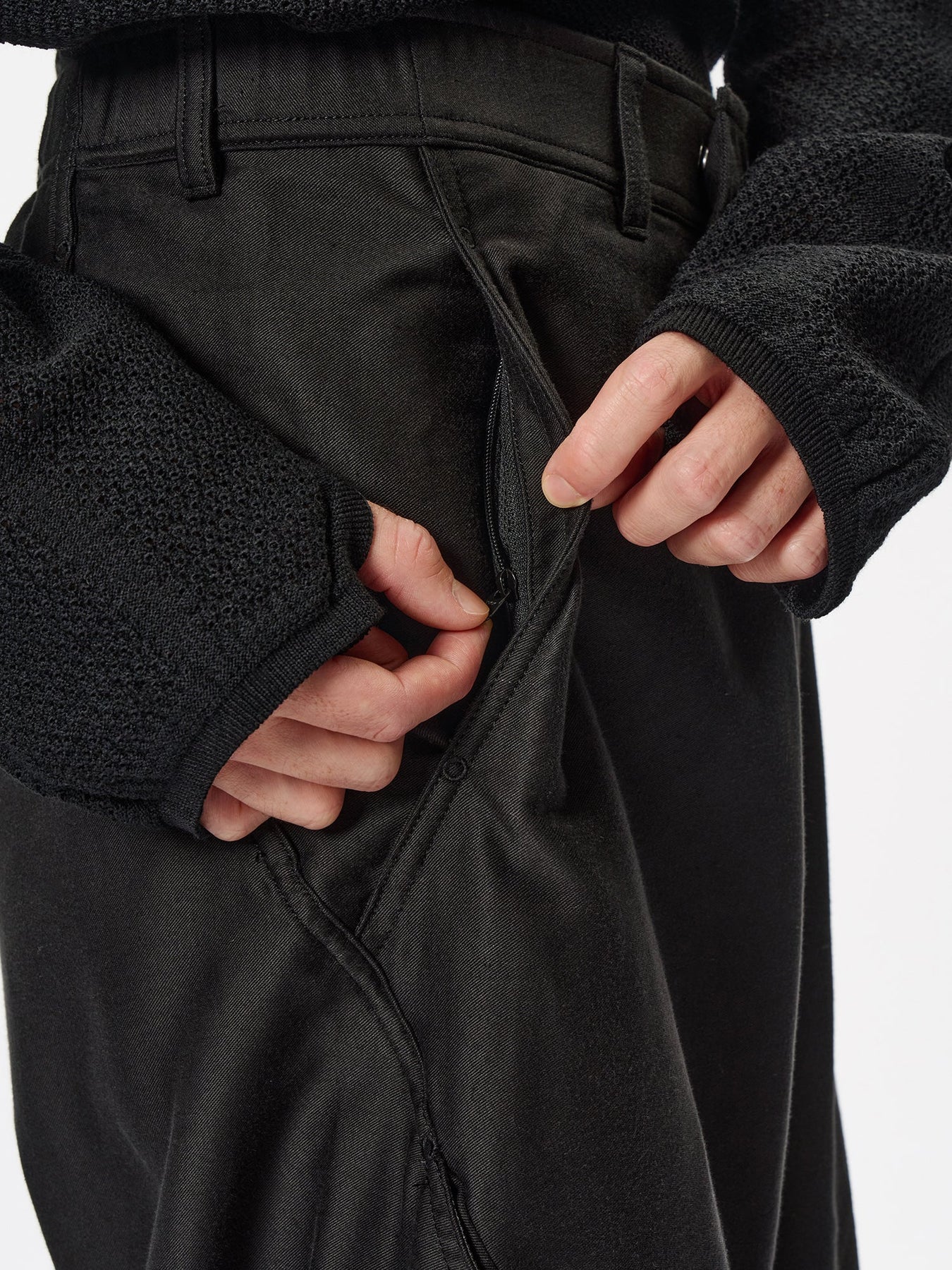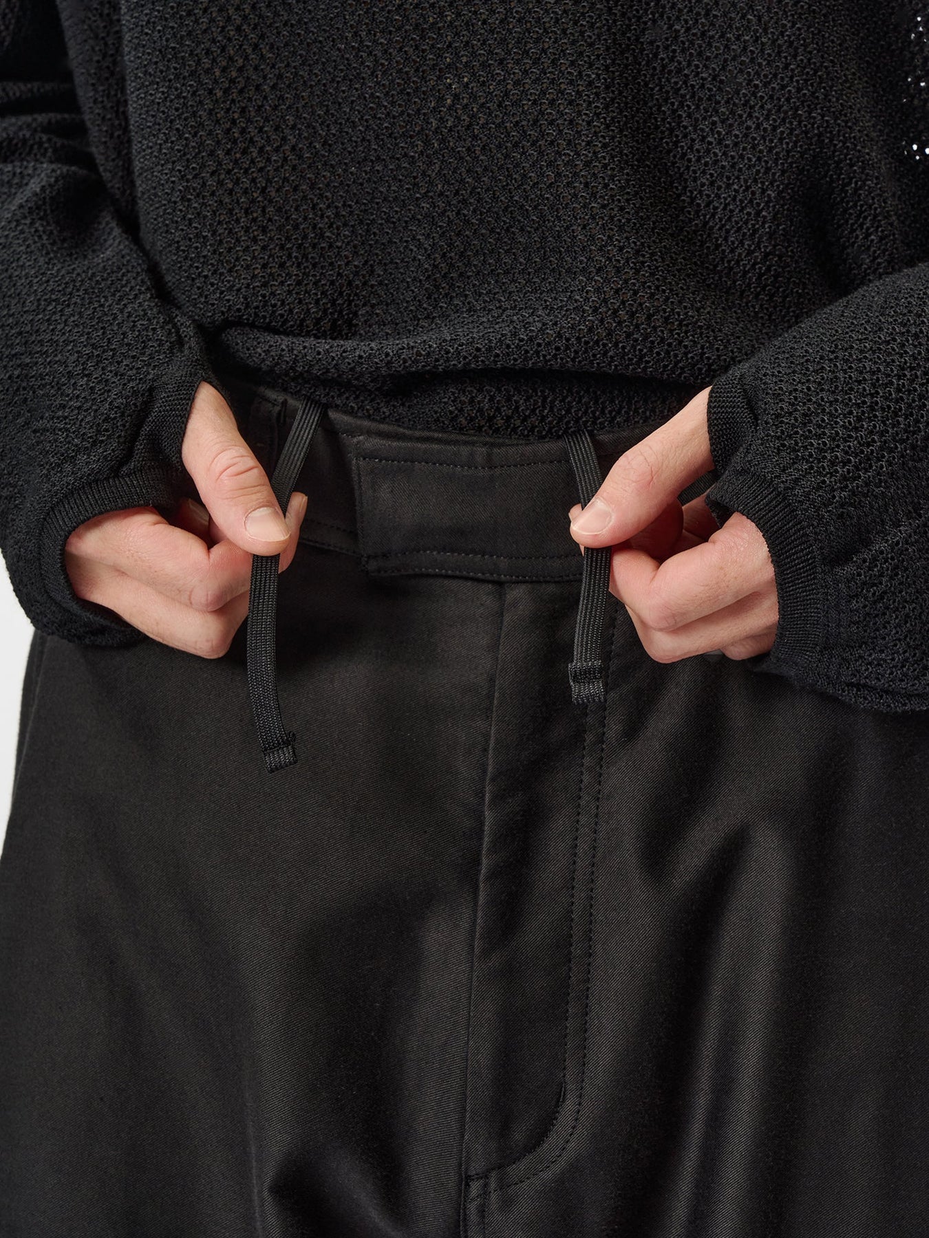 Goldwin 0’s FW25 collection explores structural innovation through design. Wide pants engineered with a spiral structure for a sculptural, three-dimensional silhouette. Crafted in cotton-silk moleskin with a smooth touch and elegant sheen, structured by the fabric’s natural firmness.