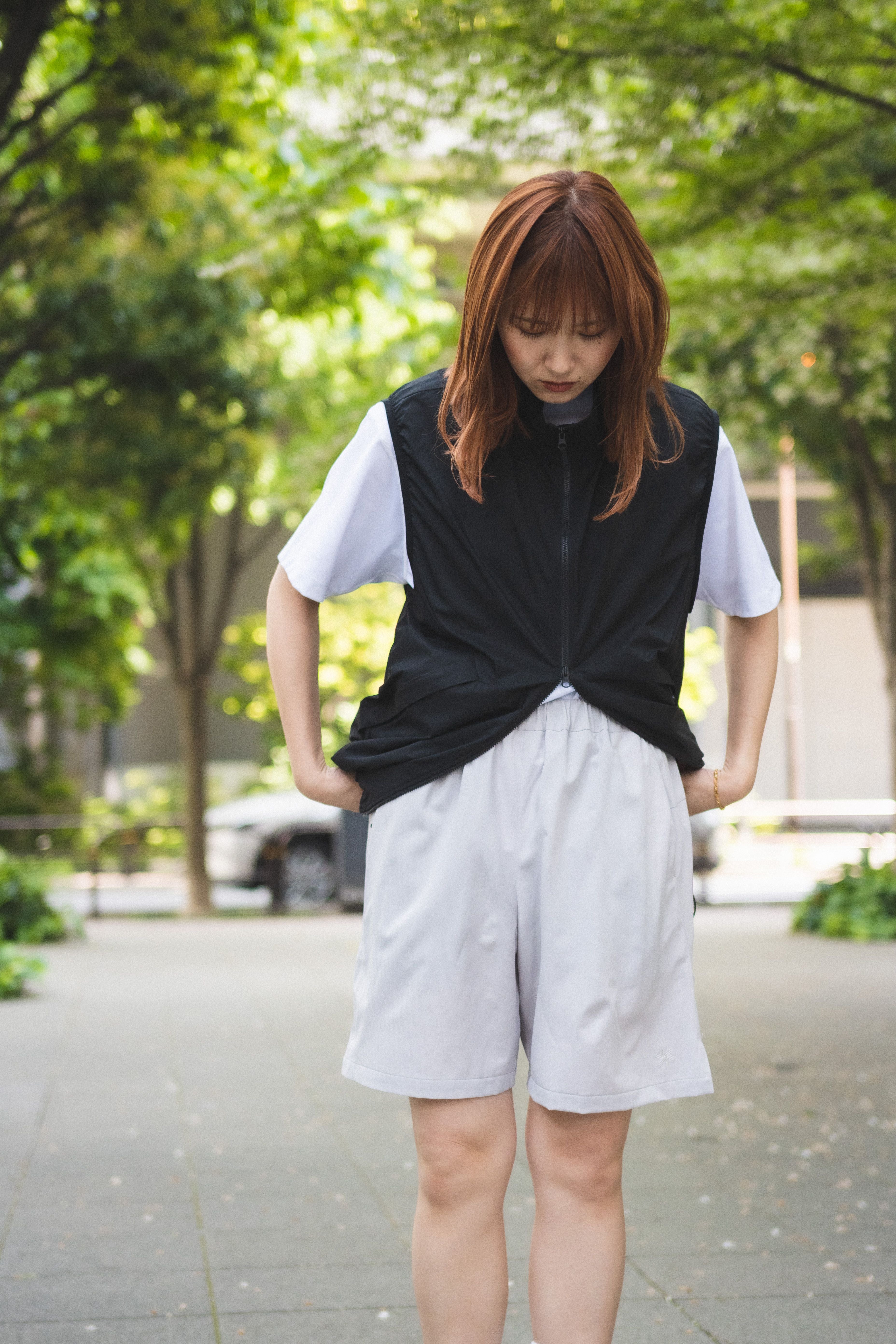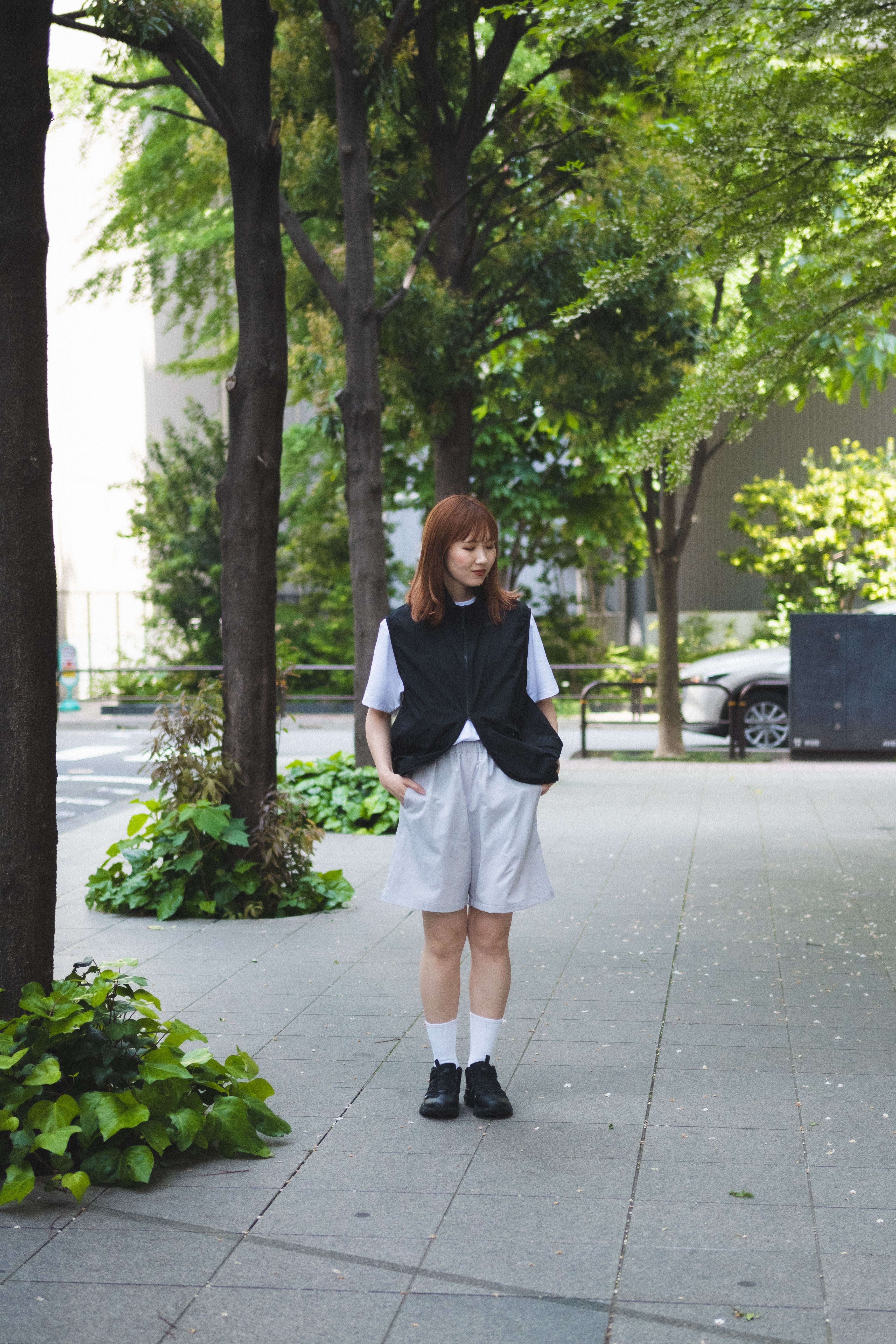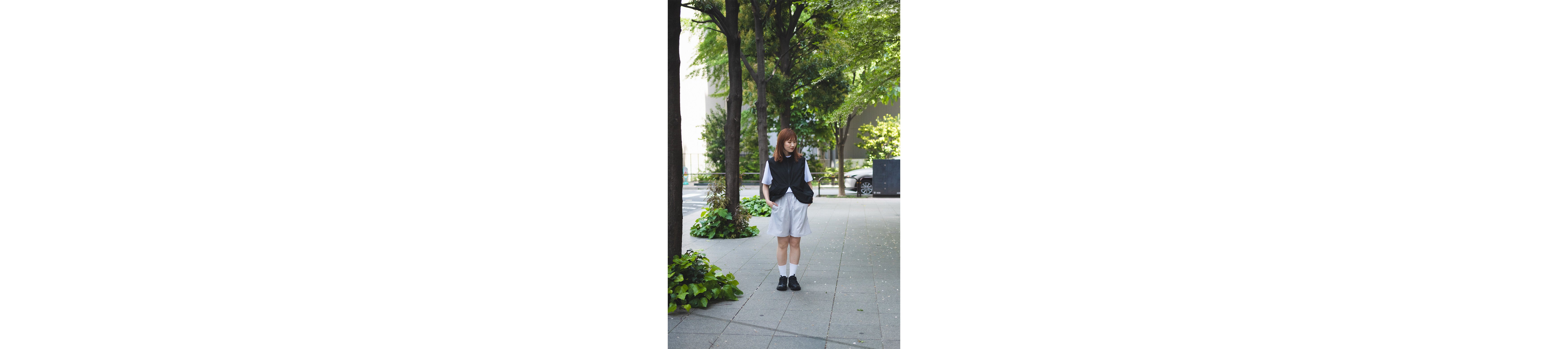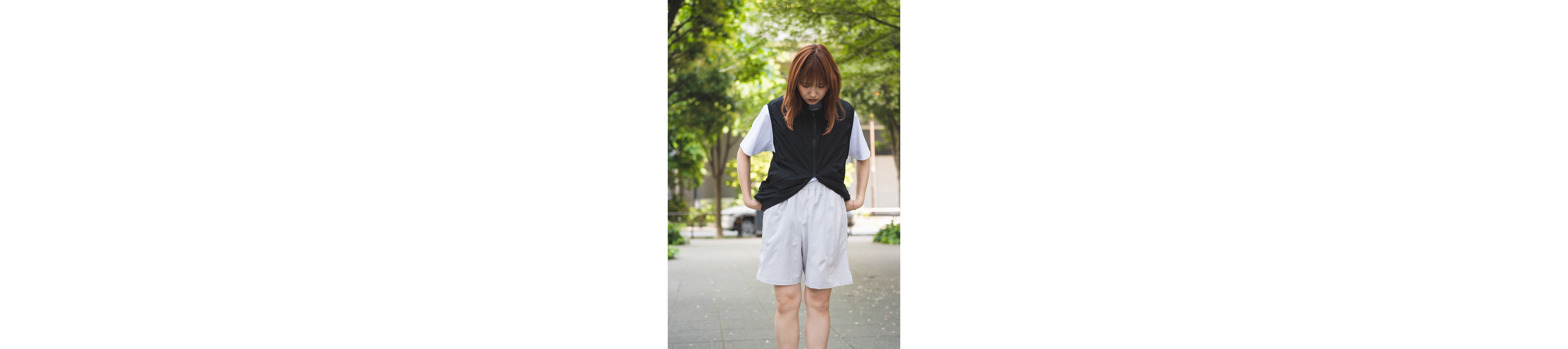 With their sporty texture, these shorts lend themselves to a sharp, active look. To avoid a too-youthful impression that sometimes comes with a simple tee-and-shorts combo, we added a structured vest and stuck to monochrome tones—creating a more refined, grown-up finish.