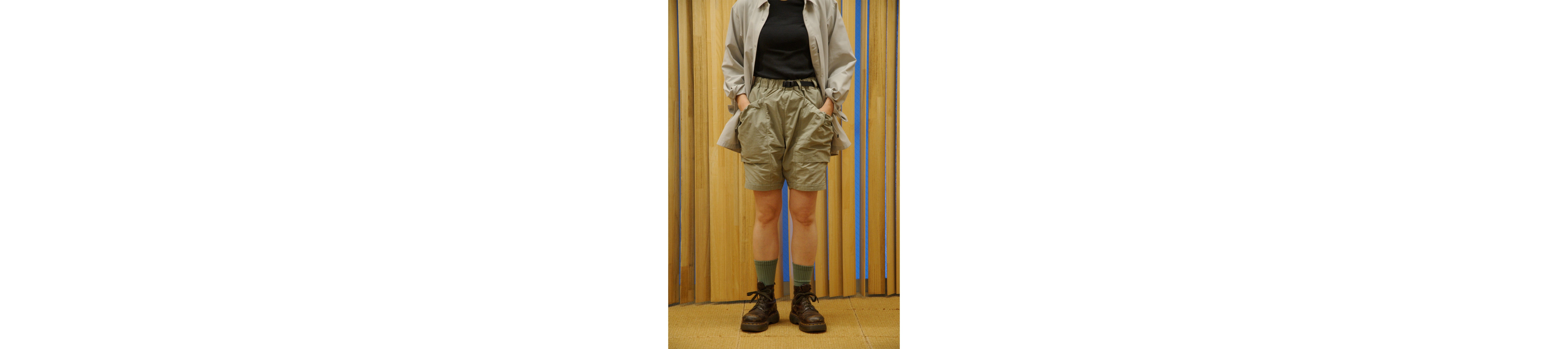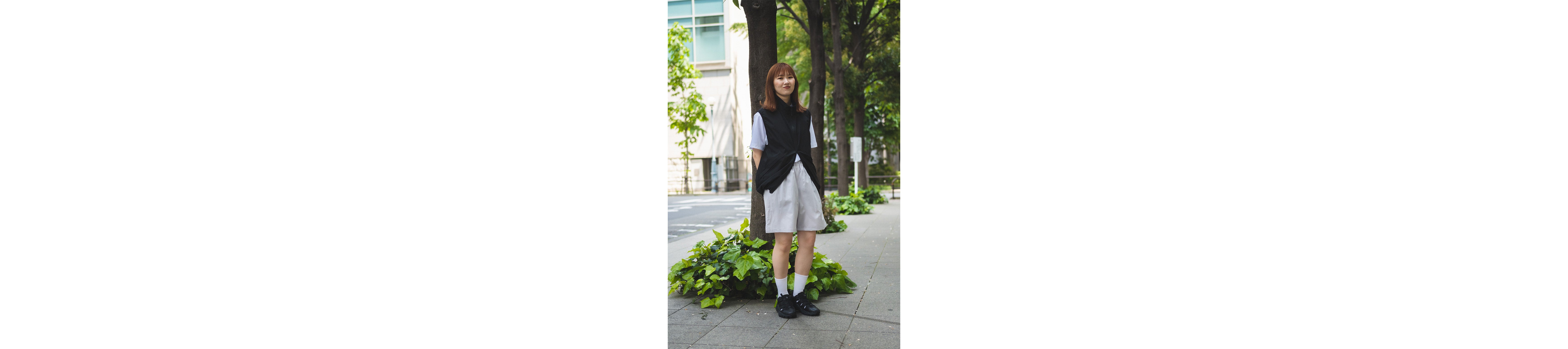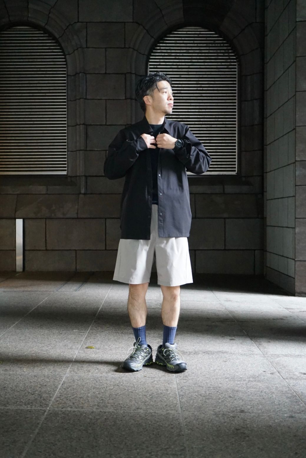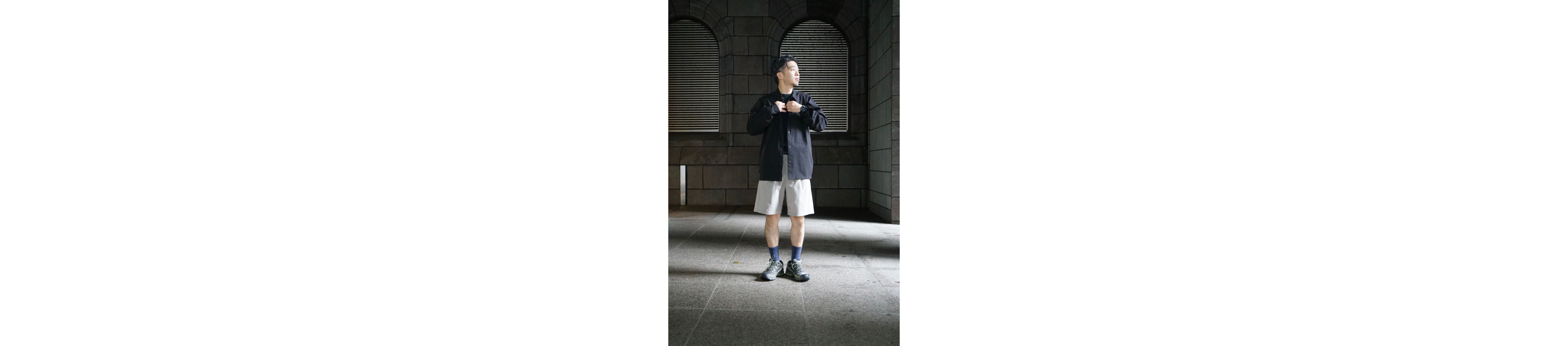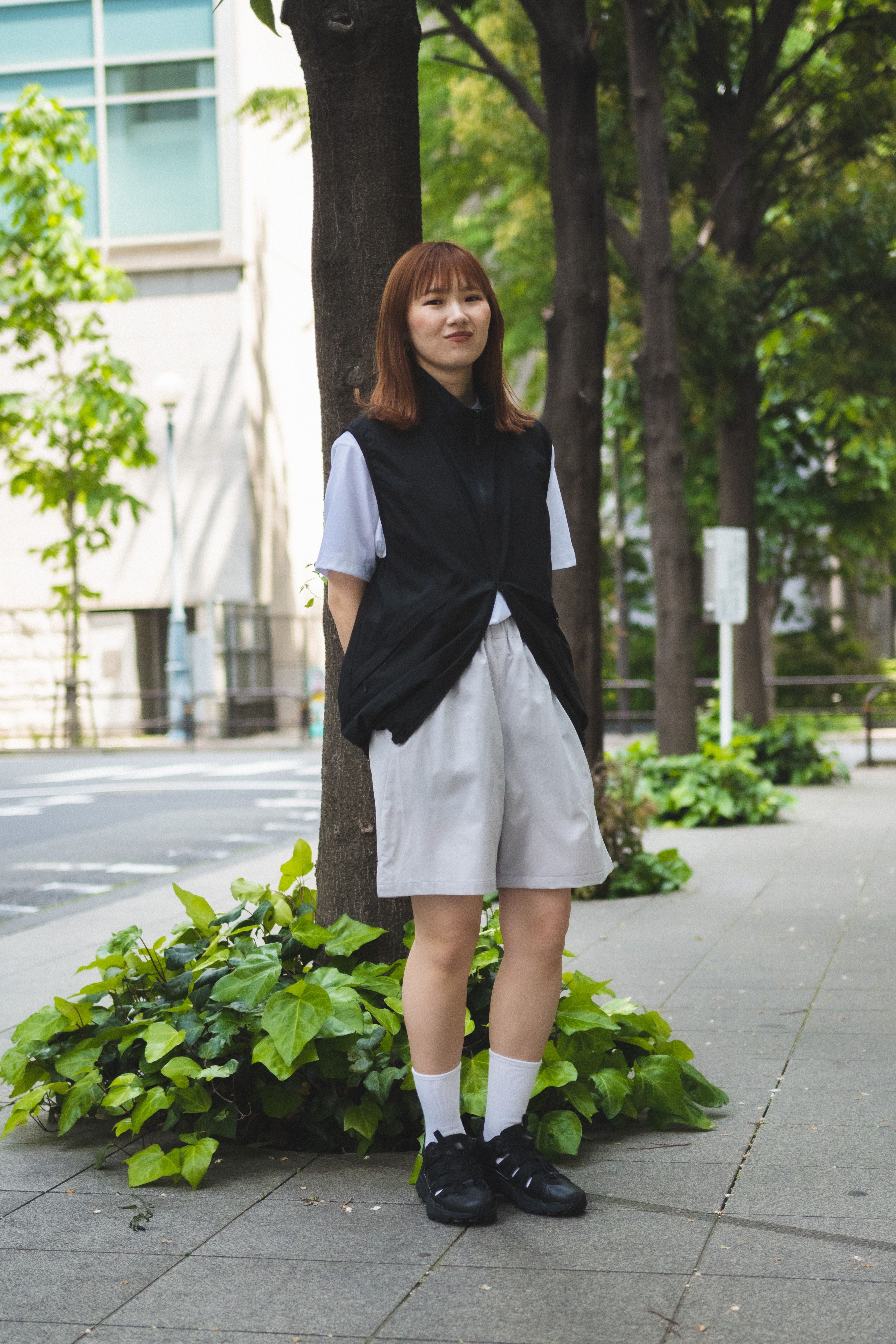 With their sporty texture, these shorts lend themselves to a sharp, active look. To avoid a too-youthful impression that sometimes comes with a simple tee-and-shorts combo, we added a structured vest and stuck to monochrome tones—creating a more refined, grown-up finish.