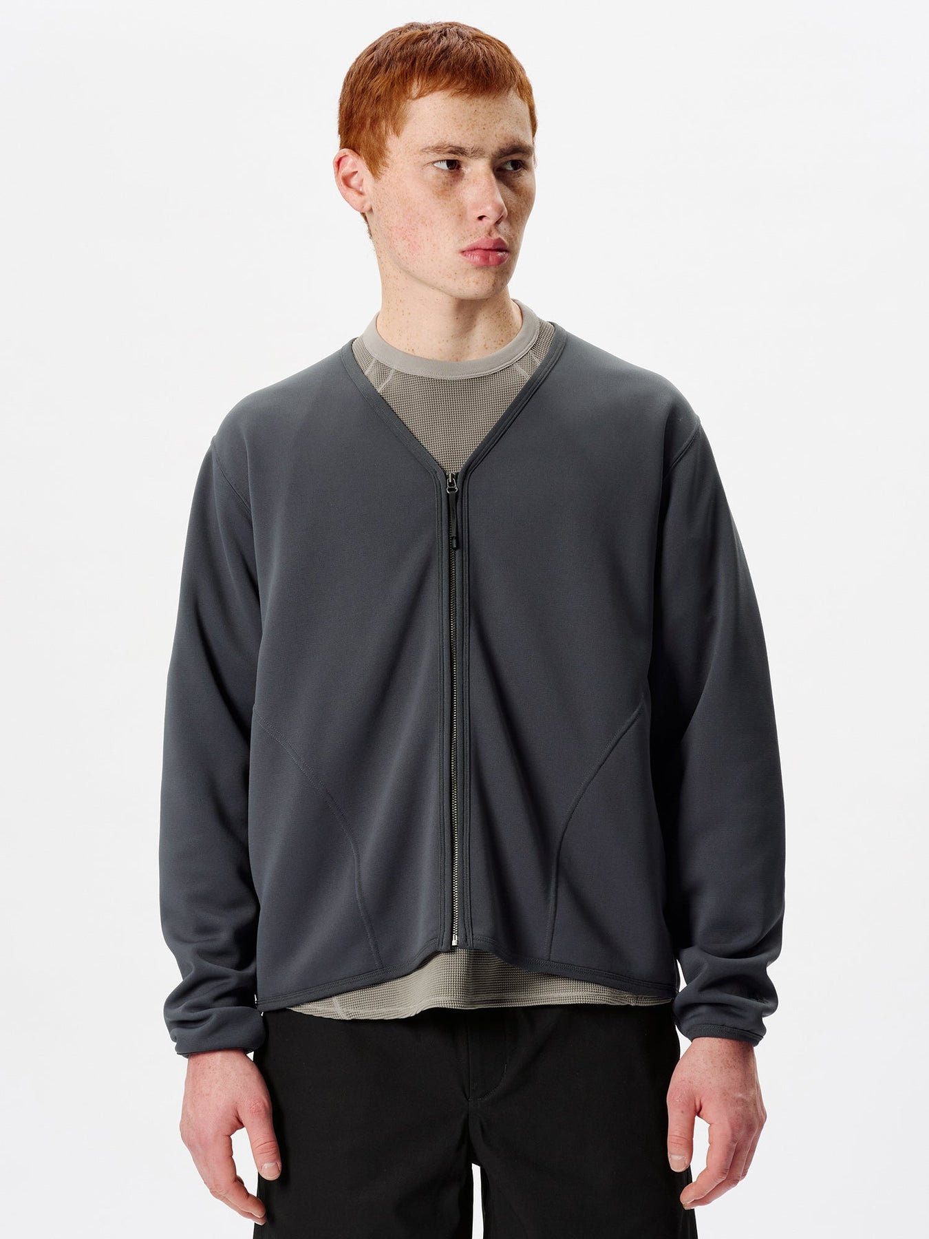 Ein technischer Sweatshirt-Cardigan, der ein klares, schlichtes Aussehen mit außergewöhnlichem Tragekomfort verbindet.
