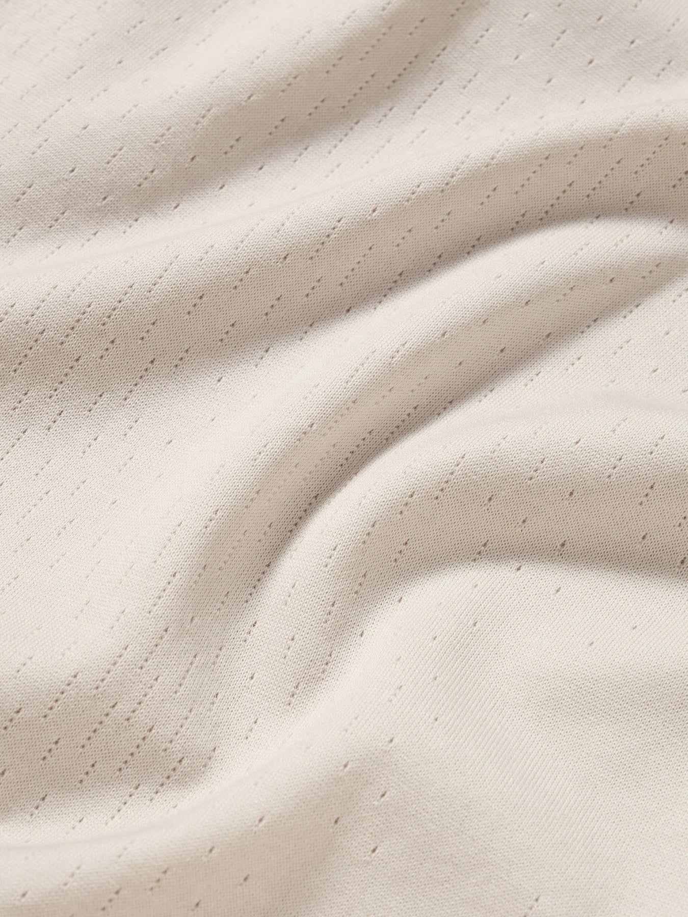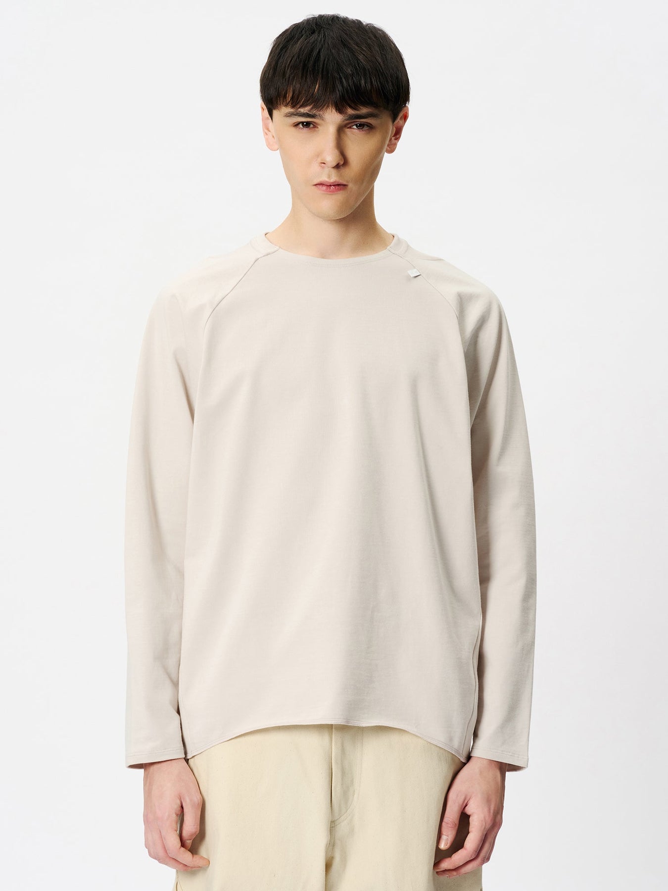 This technical long-sleeve T-shirt is crafted primarily from cotton. The front features a soft organic cotton jersey, while the back is made from a cotton-polyester mesh. The mesh placement is strategically designed based on the body’s sweat map, optimizing ventilation. It brings the performance-inspired ideas of high-tech T-shirts to a casual, cotton-focused silhouette for everyday wear.